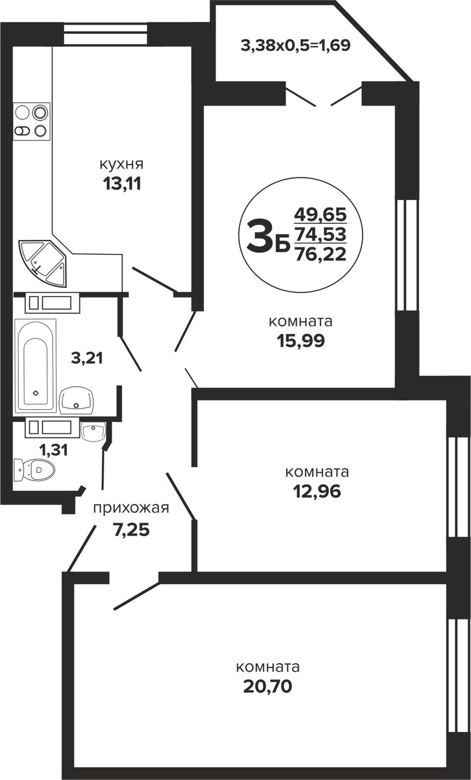 3-комнатная — 76,22 м² 23/24 эт. в Гулливер