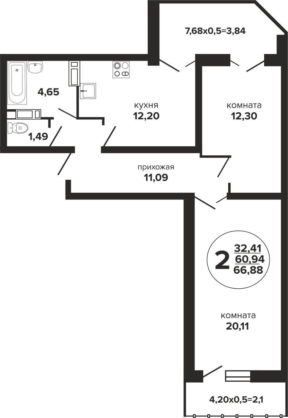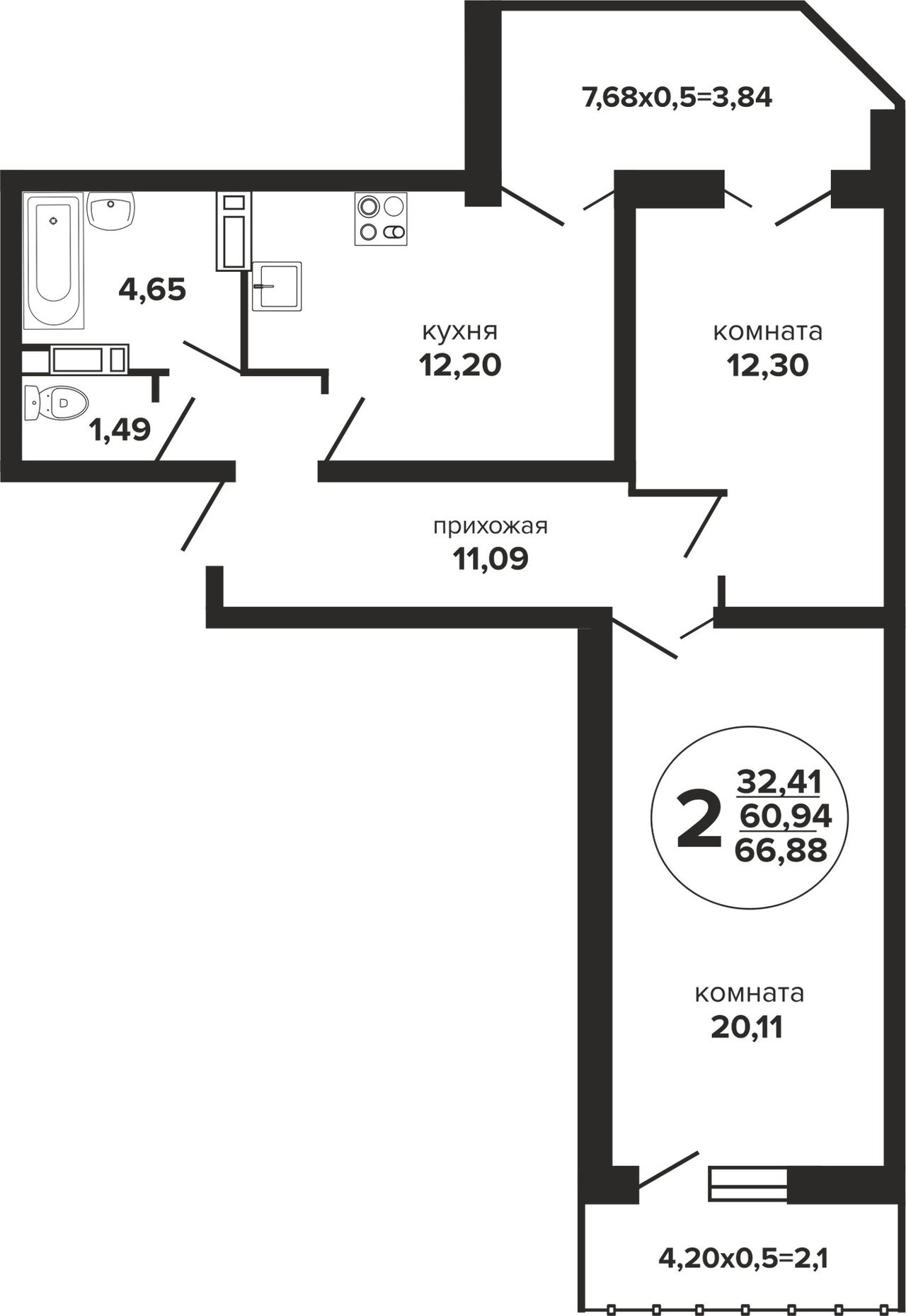 2-комнатная — 66,88 м² 19/24 эт. в Гулливер