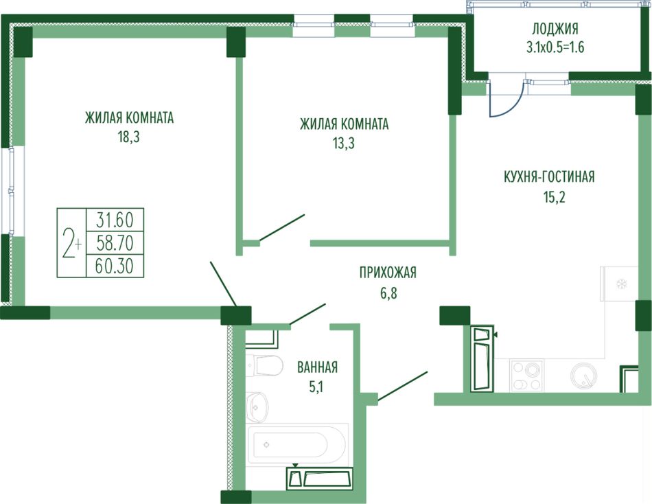 Жилая площадь31,6 м²
