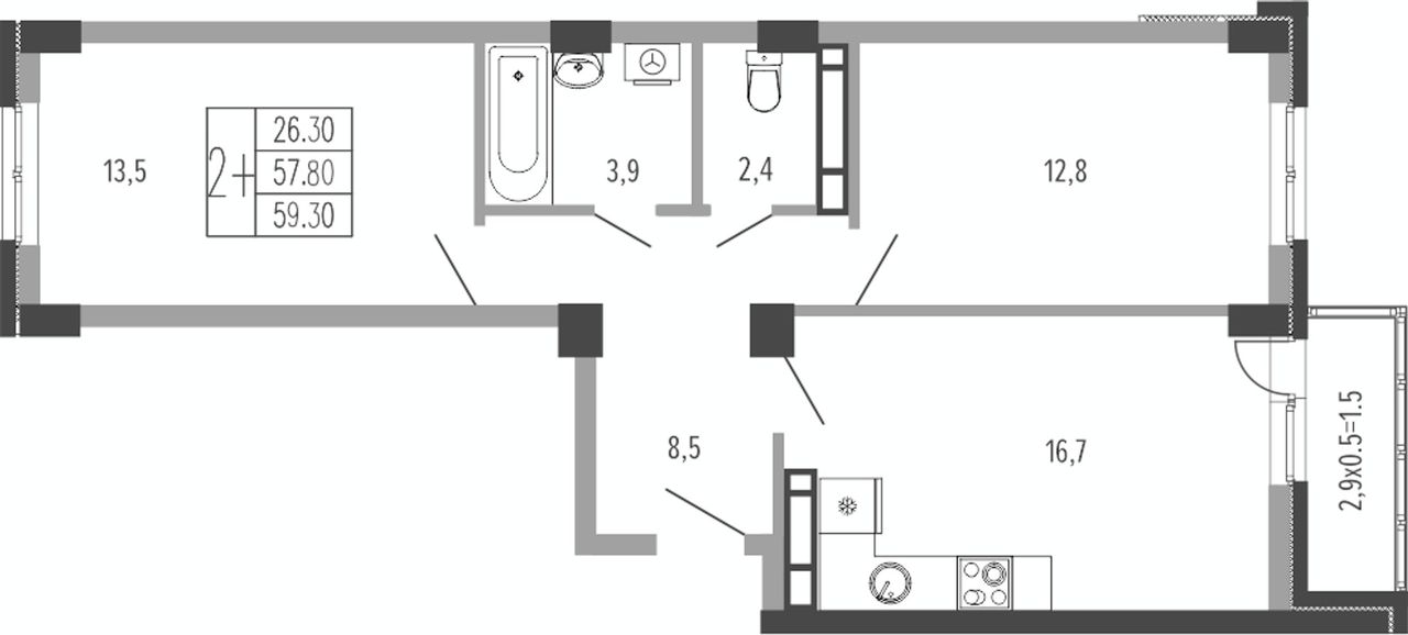 2-комнатная — 60,85 м² 1/15 эт. в Екатерининский парк