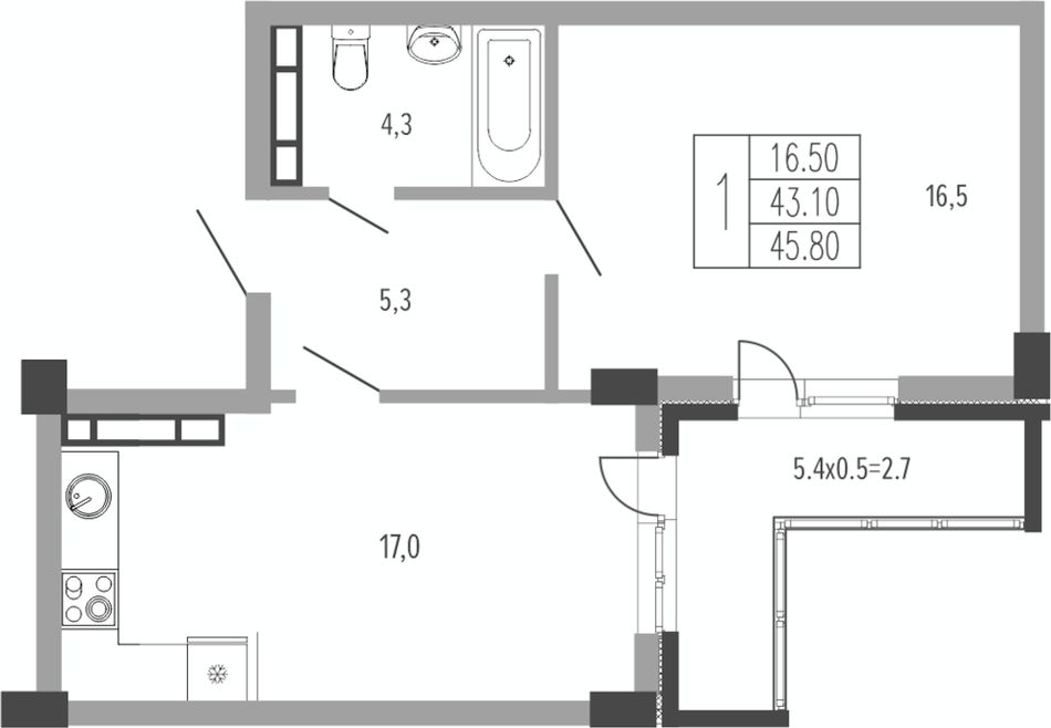 1-комнатная — 47,3 м² 1/15 эт. в Екатерининский парк