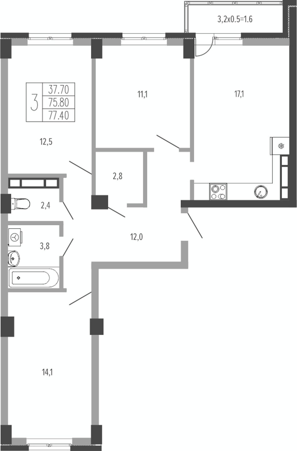 3-комнатная — 78,6 м² 1/15 эт. в Екатерининский парк