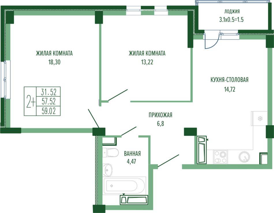 2-комнатная — 61,05 м² 2/4 эт. в Екатерининский парк