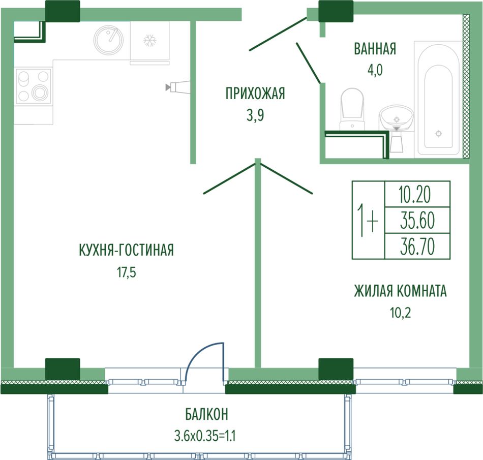 1-комнатная — 38,34 м² 1/5 эт. в Екатерининский парк