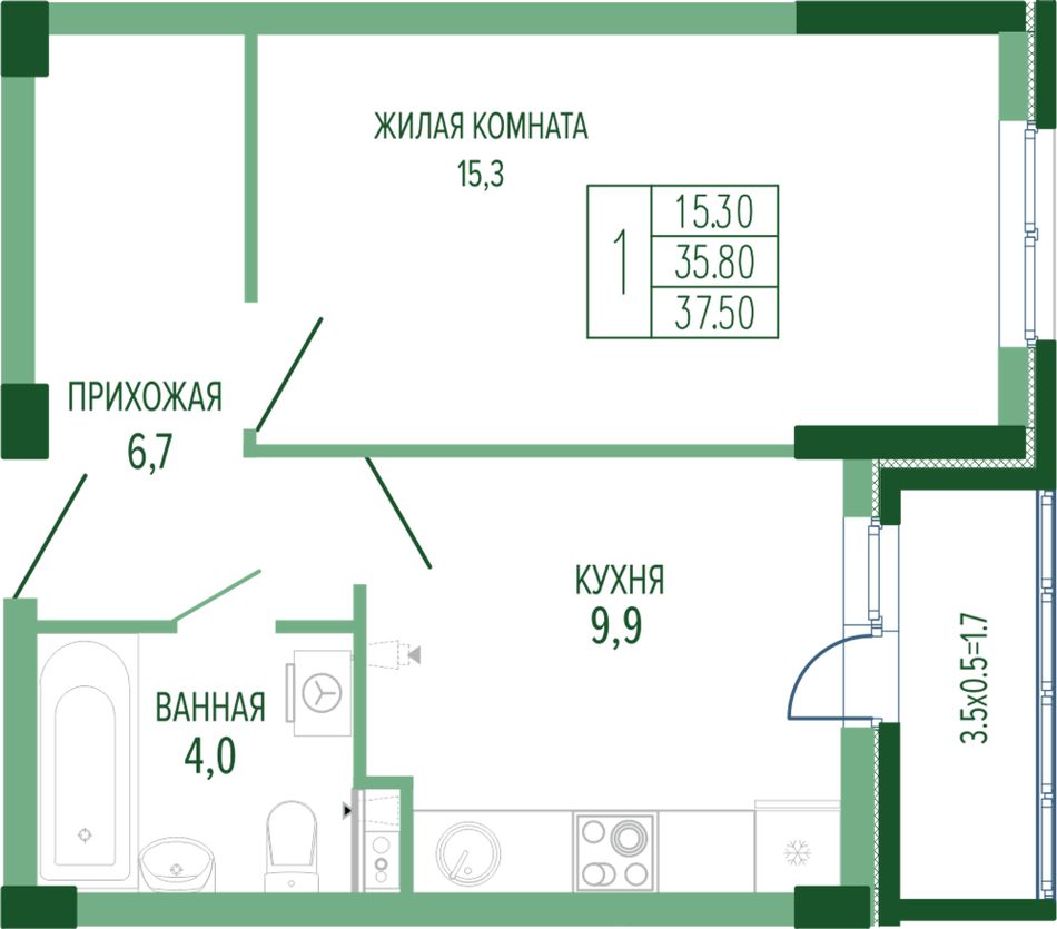 1-комнатная — 38,4 м² 1/7 эт. в Екатерининский парк
