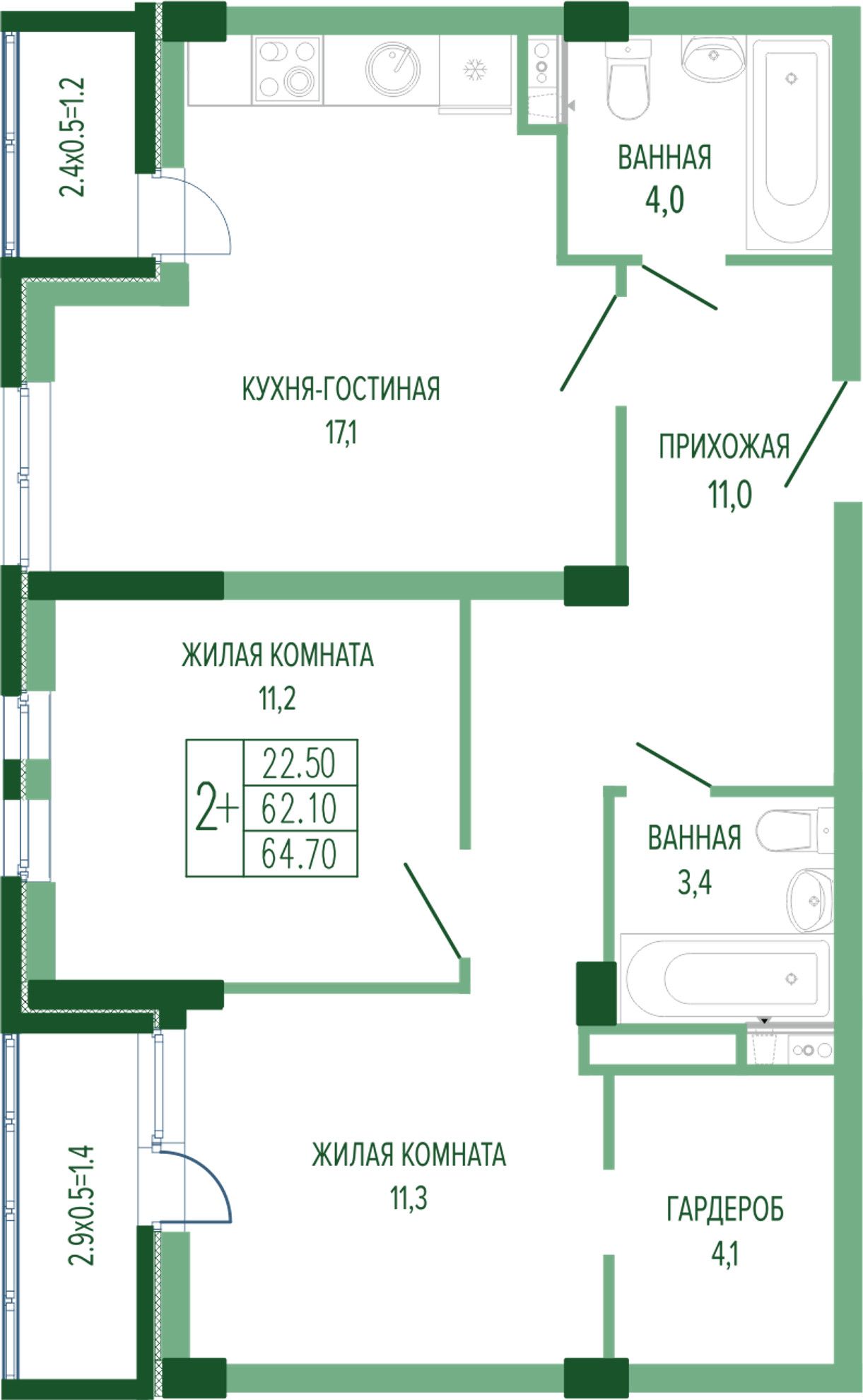 | Студия | 24 - 28 м² | 3,8 - 4,4 млн ₽ |