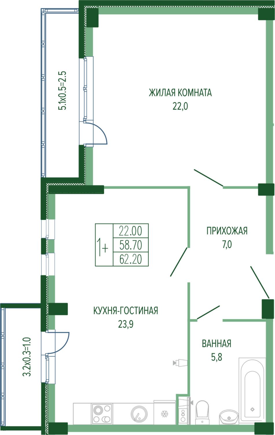 1-комнатная — 63,32 м² 1/7 эт. в Екатерининский парк