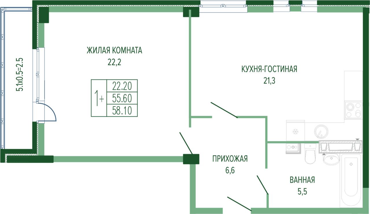 1-комнатная — 59,5 м² 4/7 эт. в Екатерининский парк
