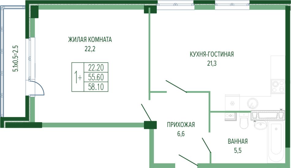1-комнатная — 59,25 м² 5/7 эт. в Екатерининский парк