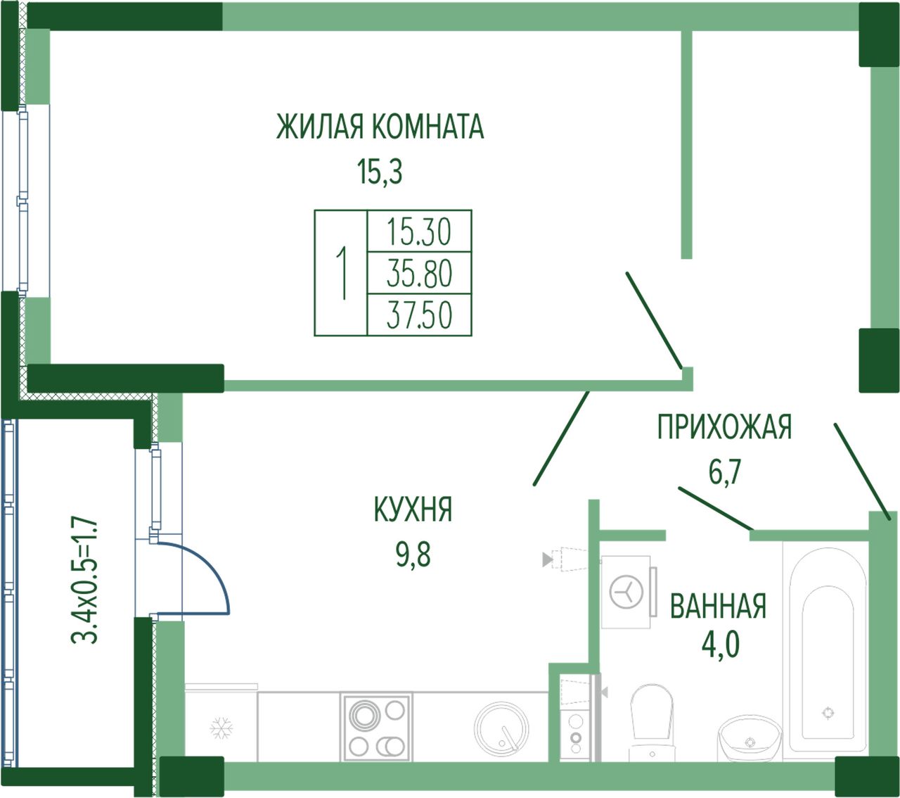 Жилая площадь15,3 м²