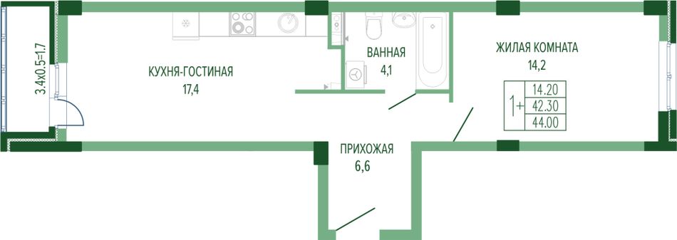 1-комнатная — 45 м² 1/7 эт. в Екатерининский парк