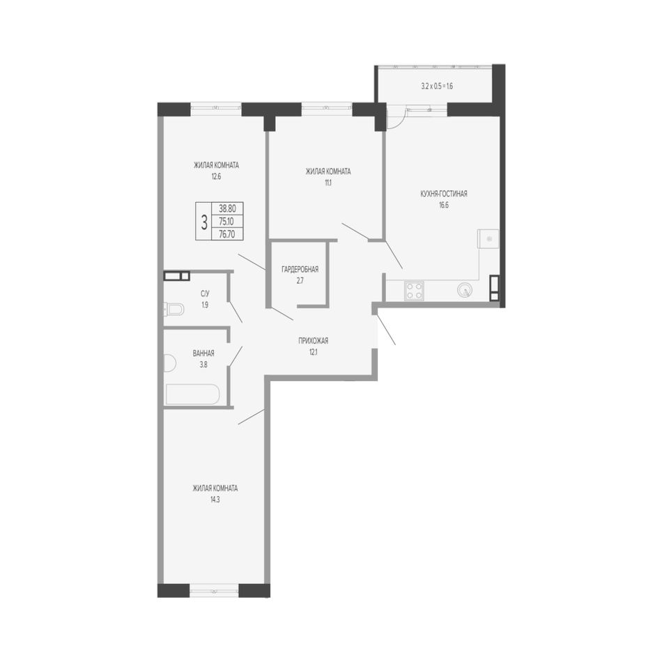 3-комнатная — 78,5 м² 3/17 эт. в Екатерининский парк