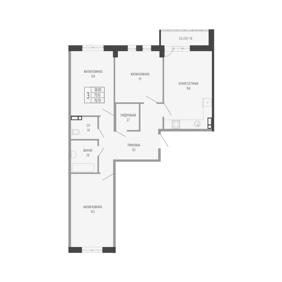3-комнатная — 76,7 м² 4/17 эт. в Екатерининский парк