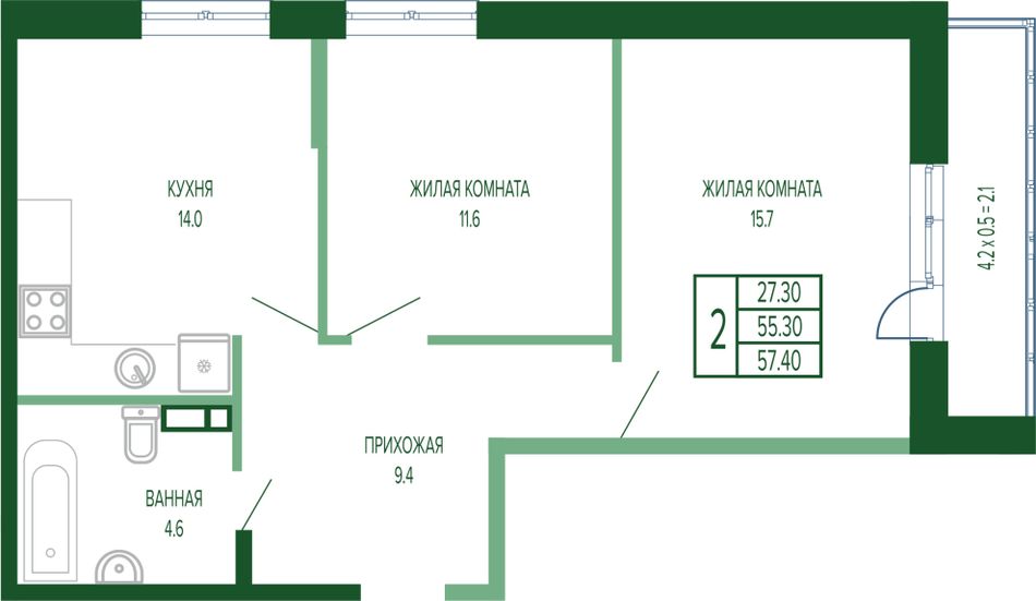 2-комнатная — 58,9 м² 2/17 эт. в Екатерининский парк