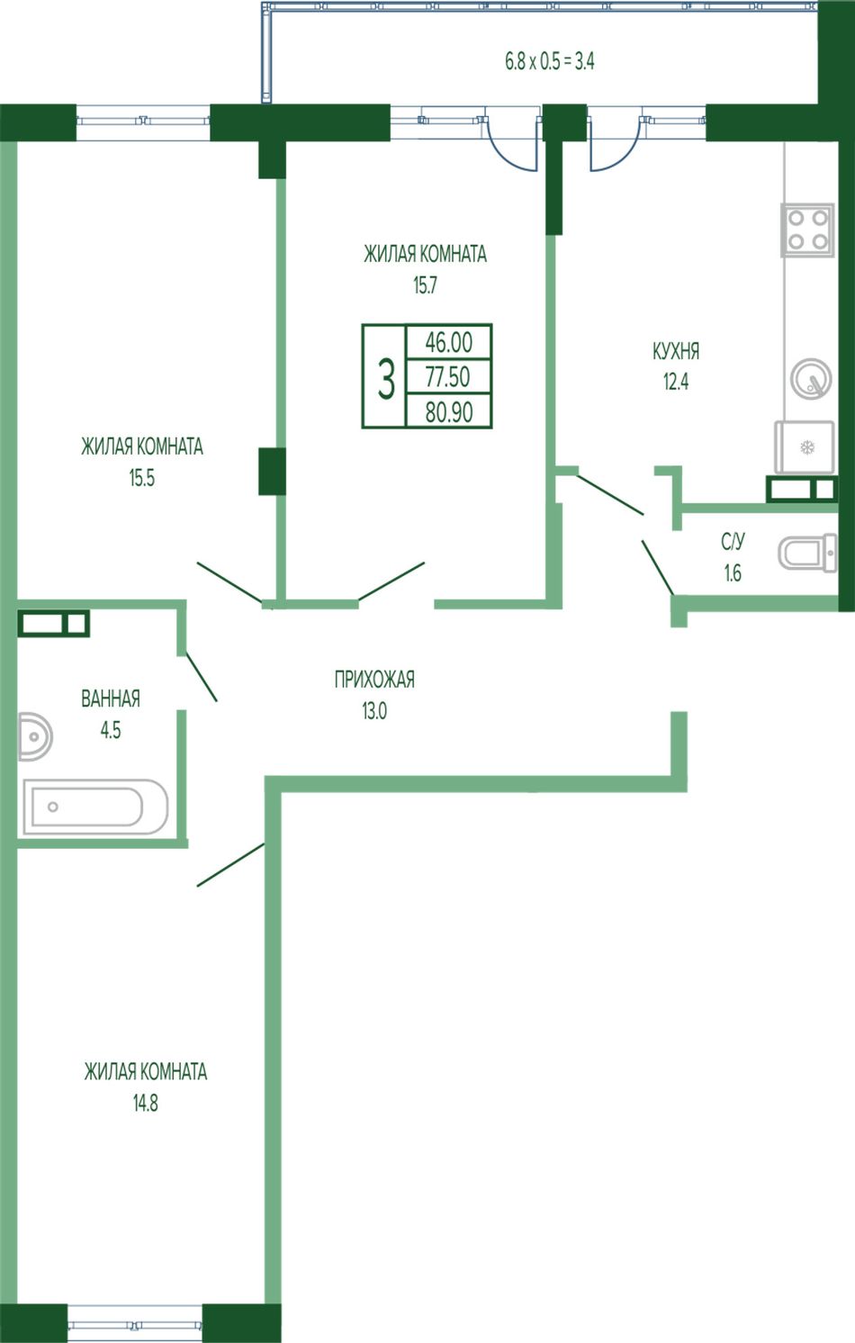 3-комнатная — 82,6 м² 2/17 эт. в Екатерининский парк