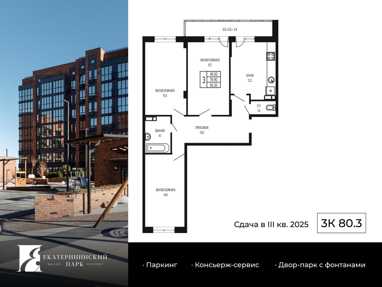 3-комнатная — 81,8 м² 6/17 эт. в Екатерининский парк