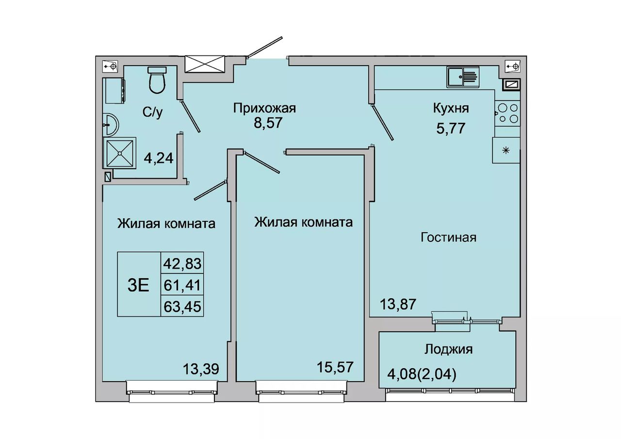 3-комнатная — 63,45 м² 2/16 эт. в Булгаков