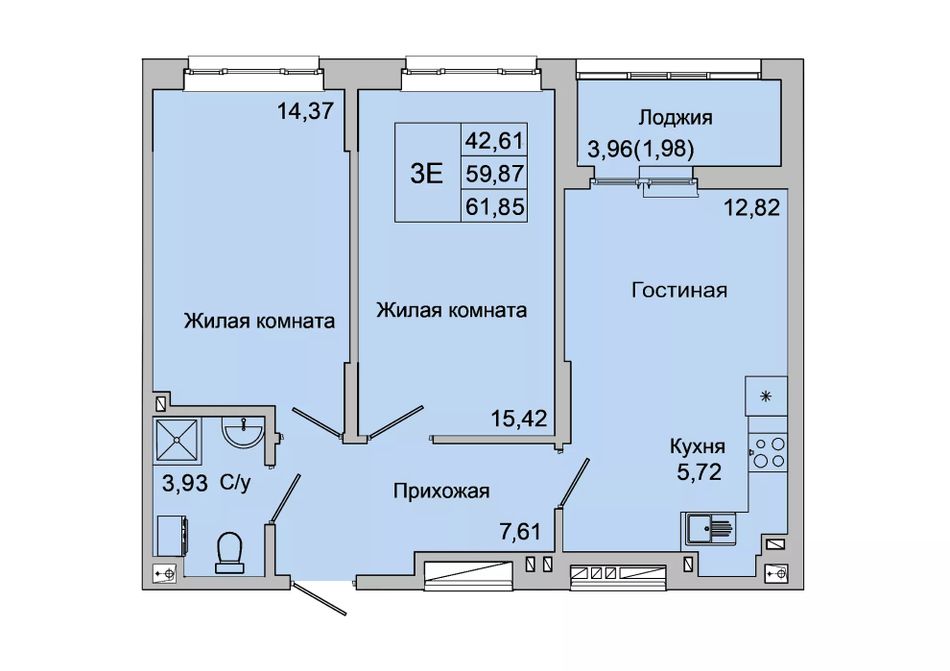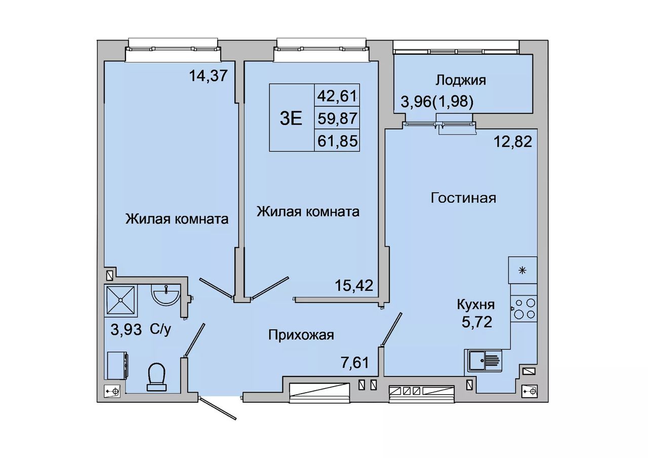 3-комнатная — 61,85 м² 2/16 эт. в Булгаков