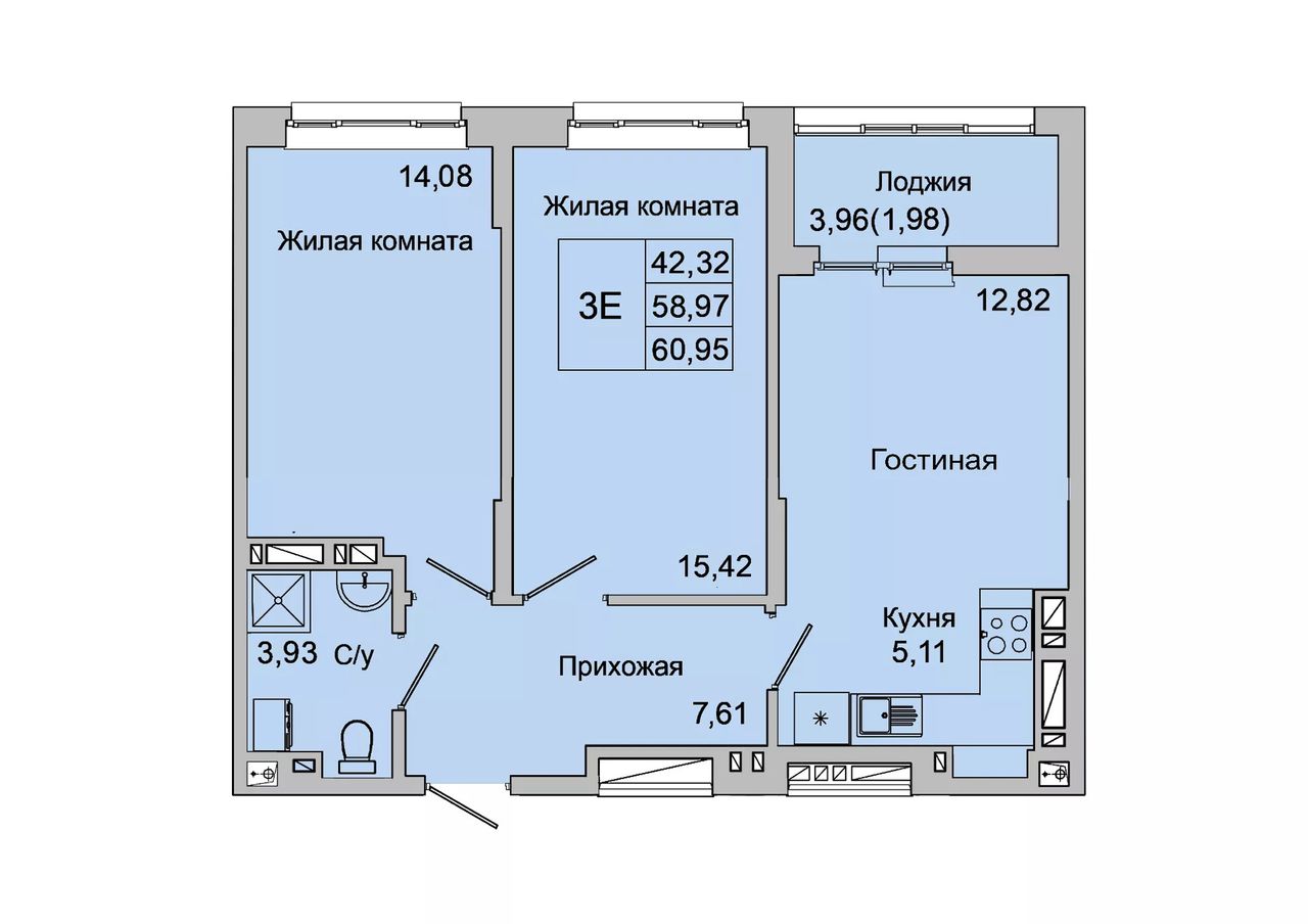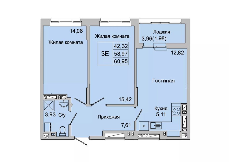 Общая площадь60,95 м²