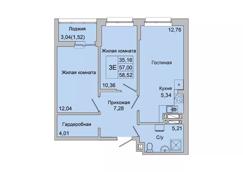 3-комнатная — 58,52 м² 15/16 эт. в Булгаков