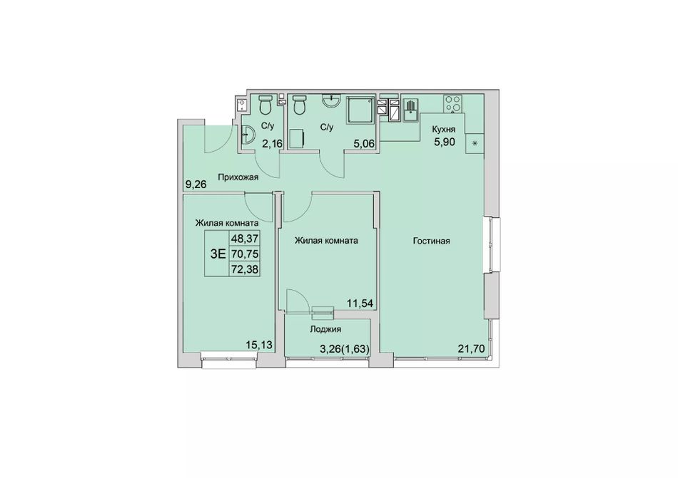 3-комнатная — 72,38 м² 2/22 эт. в Булгаков