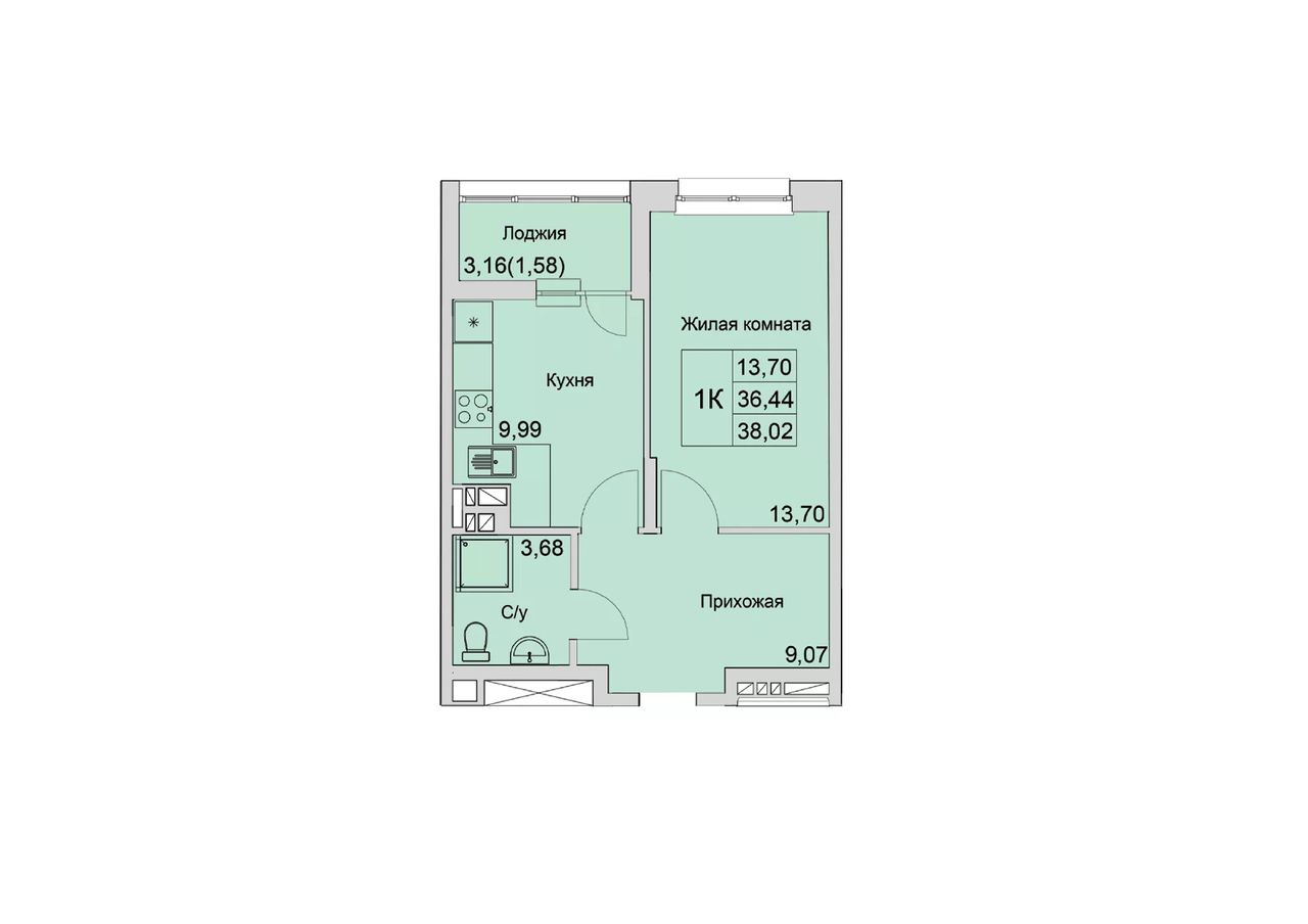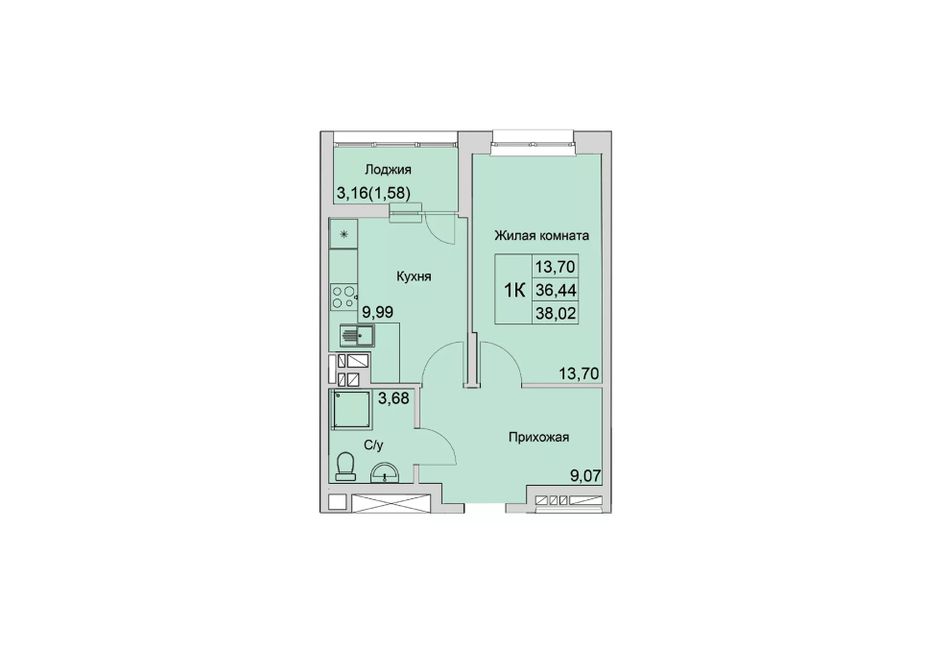 1-комнатная — 38,02 м² 3/22 эт. в Булгаков