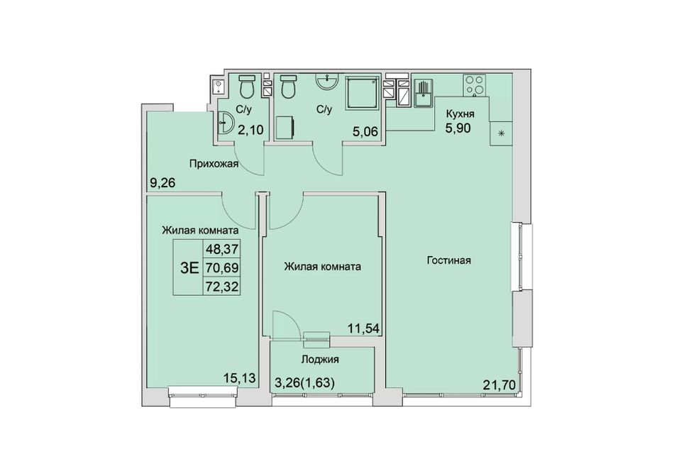 3-комнатная — 72,32 м² 5/22 эт. в Булгаков
