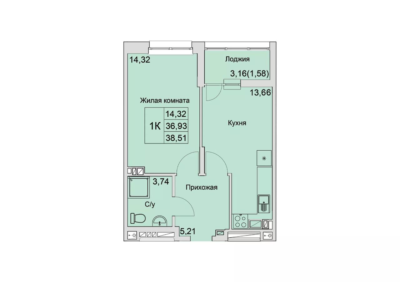 Жилая площадь14,32 м²