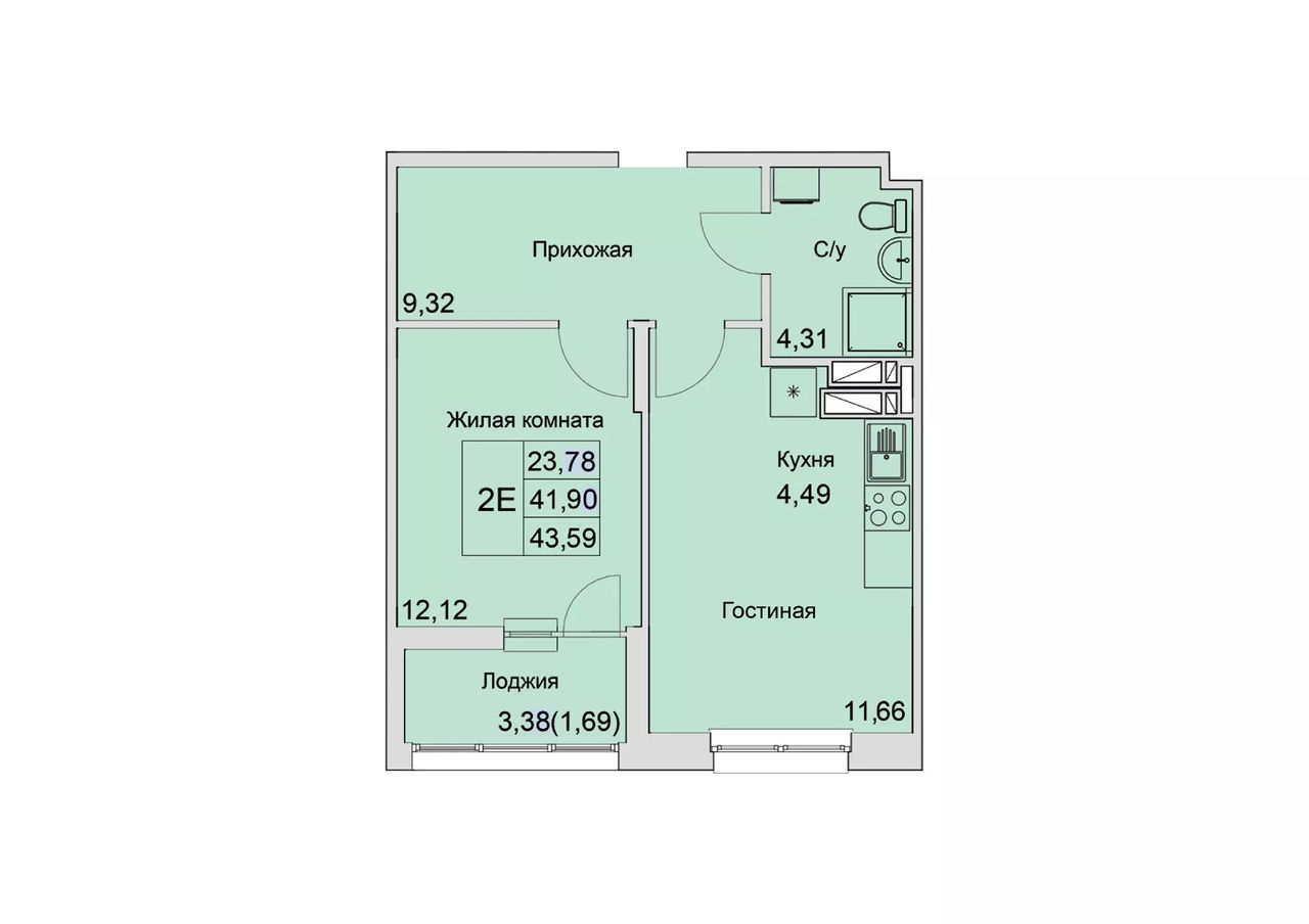 2-комнатная — 43,59 м² 10/22 эт. в Булгаков