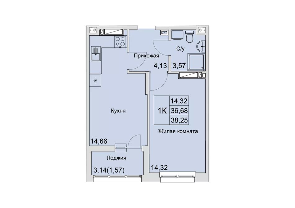 1-комнатная — 38,25 м² 15/22 эт. в Булгаков