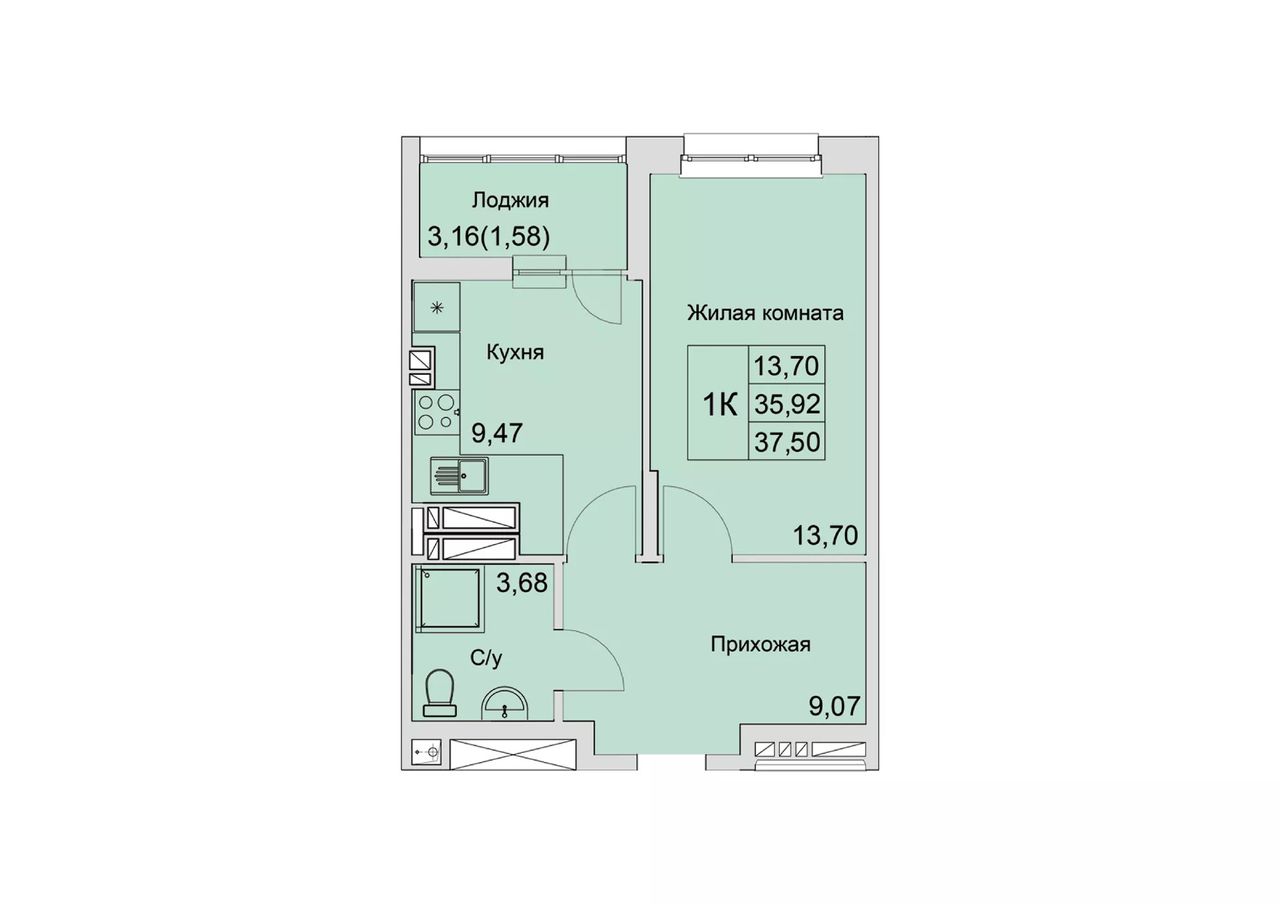 1-комнатная — 37,5 м² 20/22 эт. в Булгаков