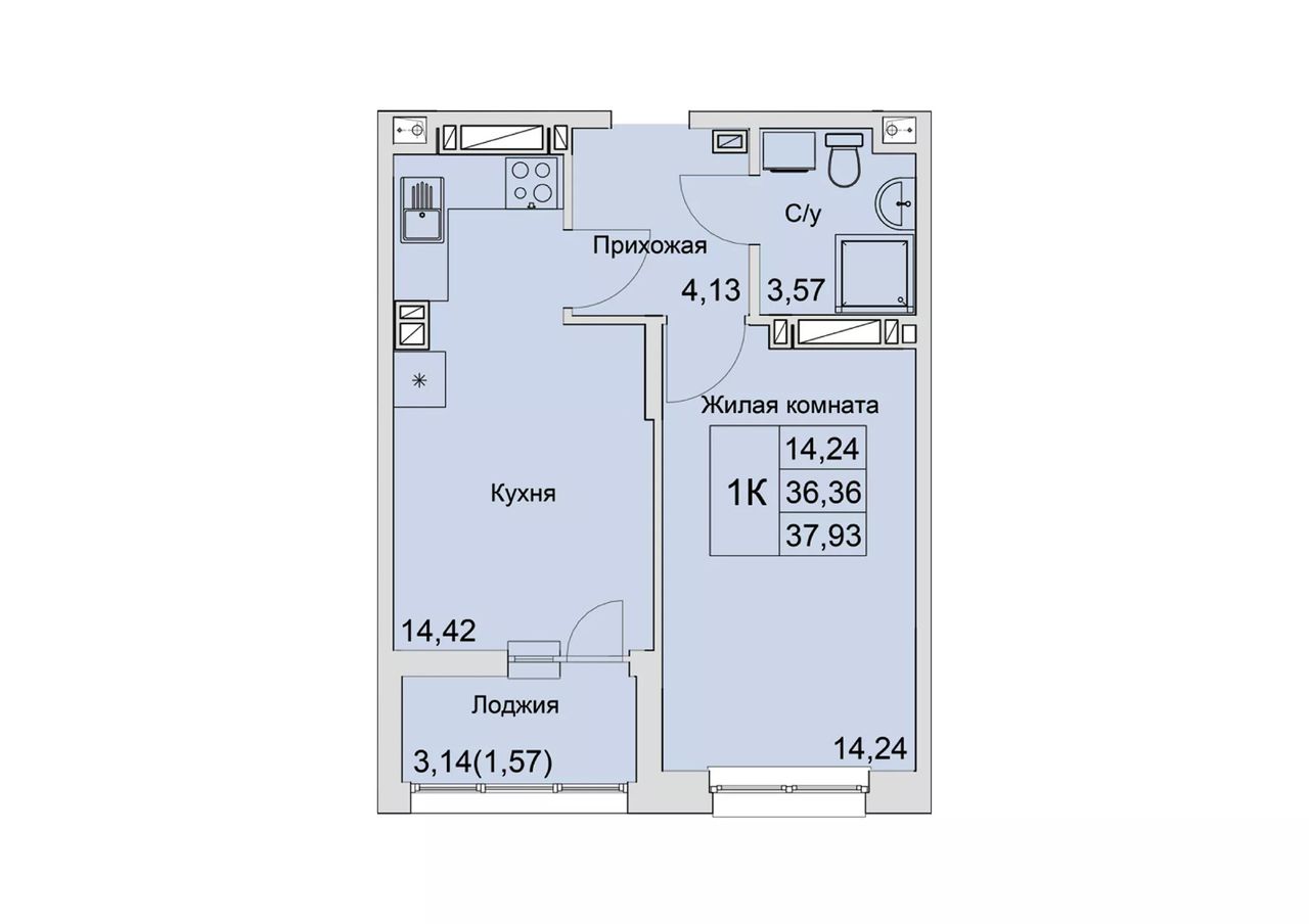 1-комнатная — 37,93 м² 22/22 эт. в Булгаков