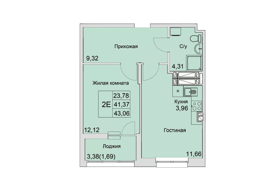 2-комнатная — 43,06 м² 22/22 эт. в Булгаков