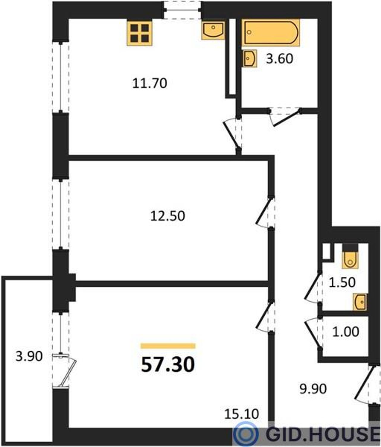 Общая площадь57,3 м²
