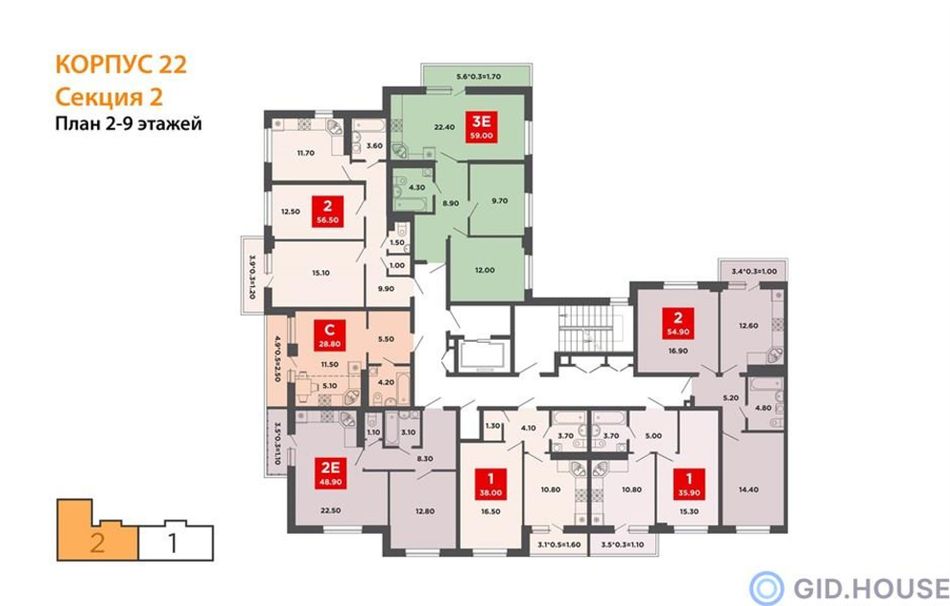 2-комнатная — 57,3 м² 9/12 эт. в Красная площадь
