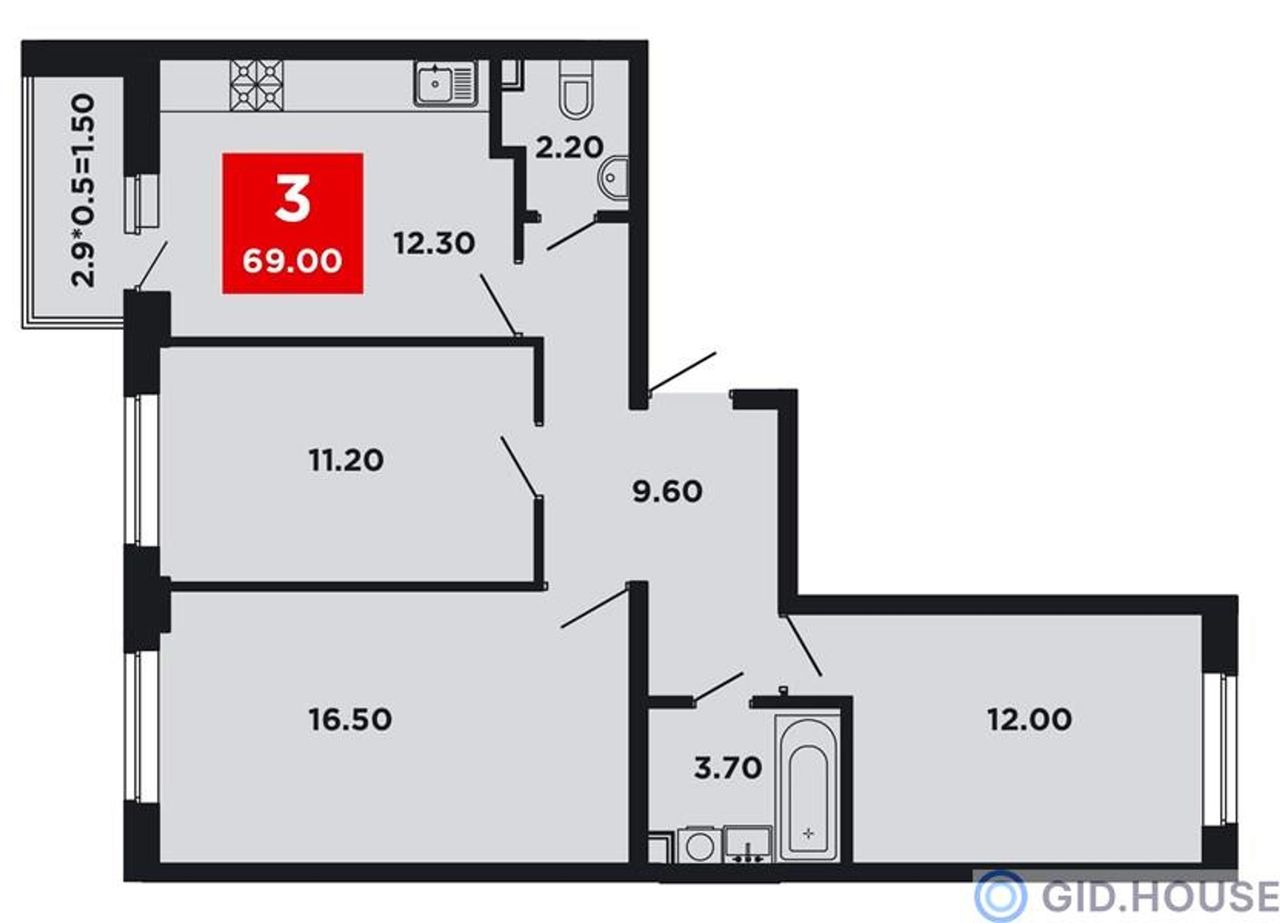 3-комнатная — 69,4 м² 1/12 эт. в Красная площадь