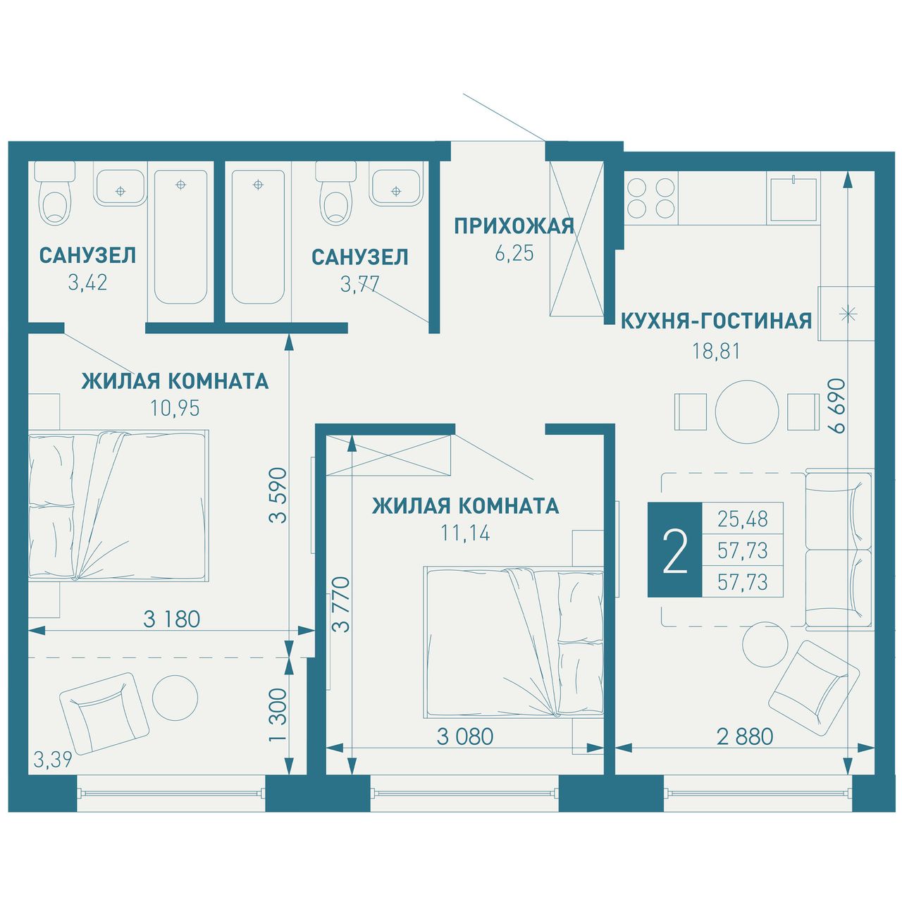 2-комнатная — 60,9 м² 4/18 эт. в ИНАЧЕ в Молодёжном