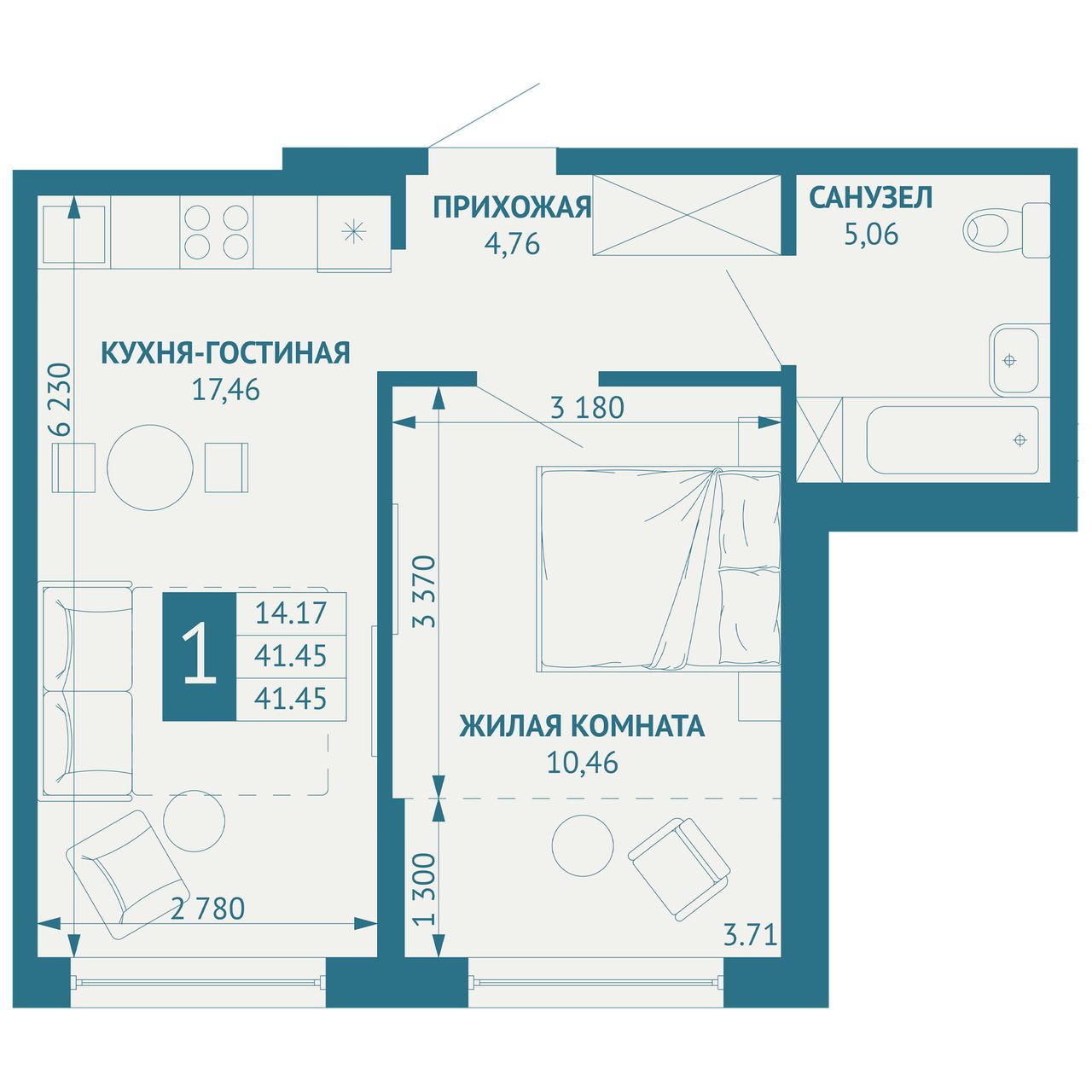 1-комнатная — 41,45 м² 7/18 эт. в ИНАЧЕ в Молодёжном