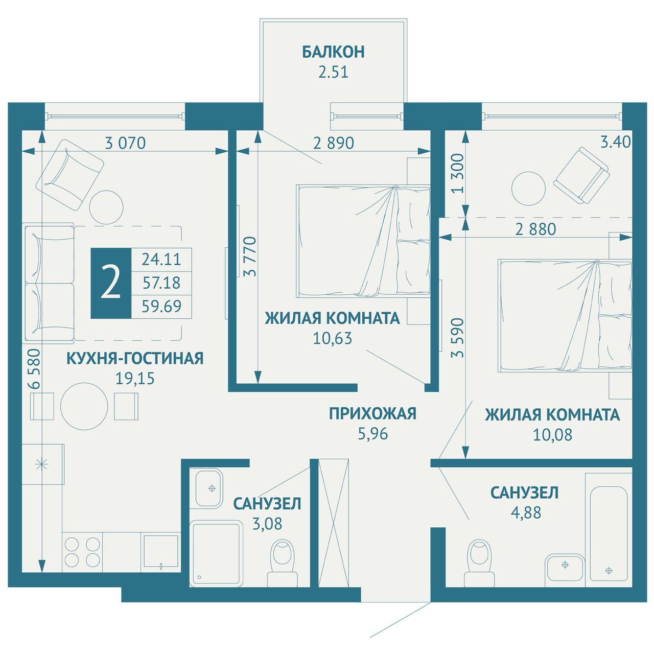 2-комнатная — 61,2 м² 6/18 эт. в ИНАЧЕ в Молодёжном