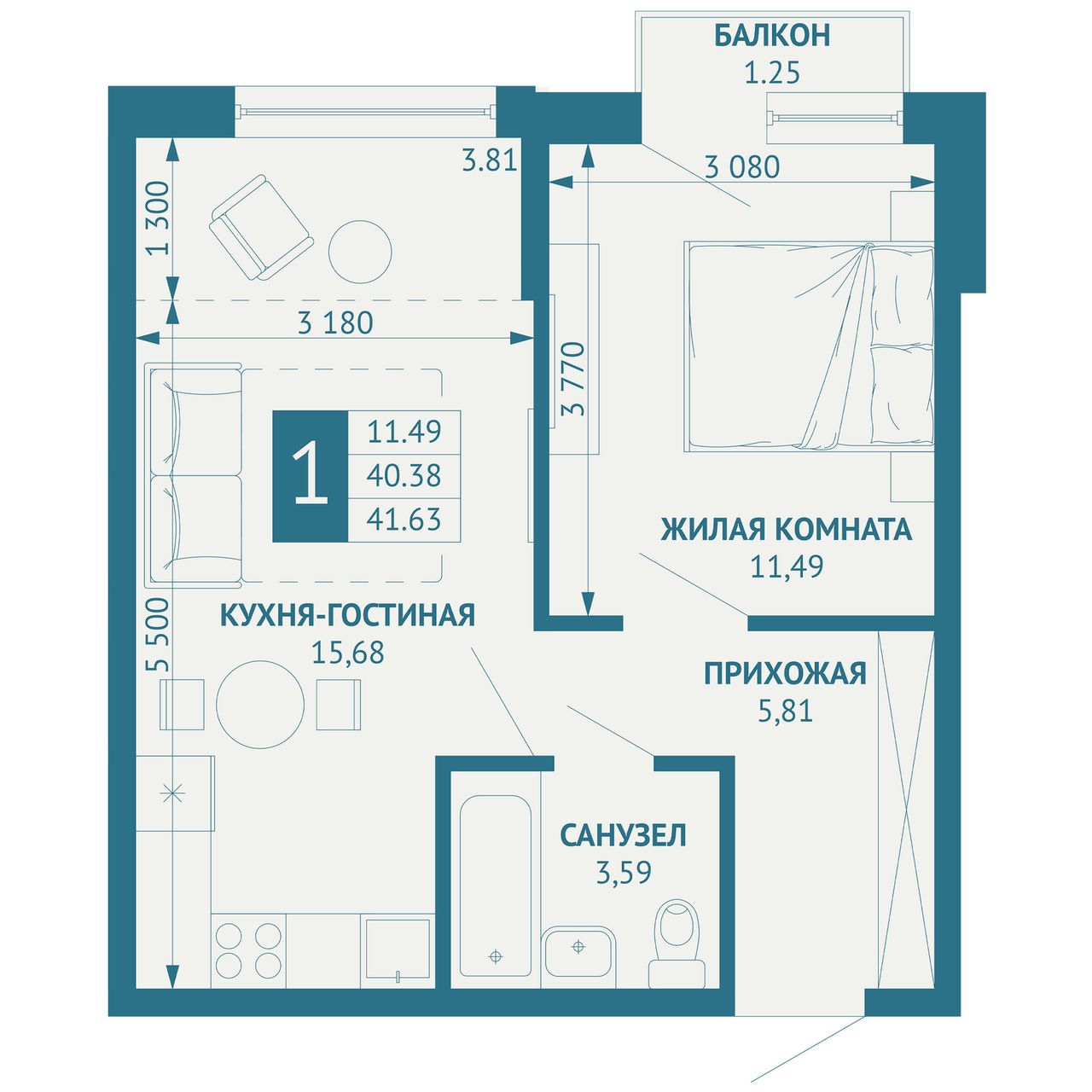 Общая площадь42,1 м²