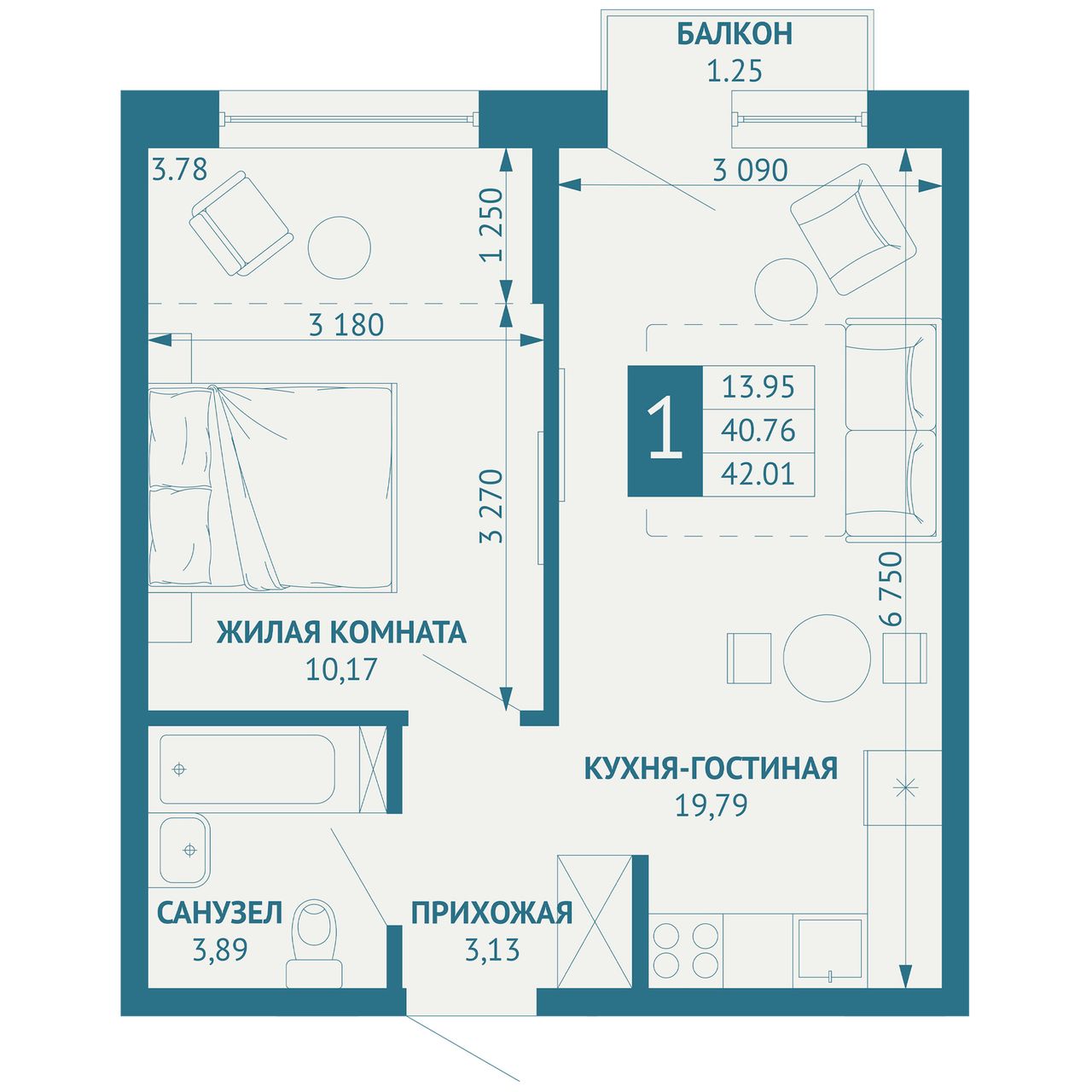 Общая площадь42,5 м²