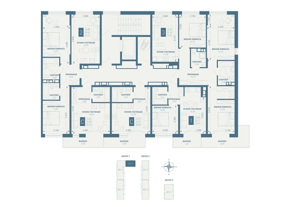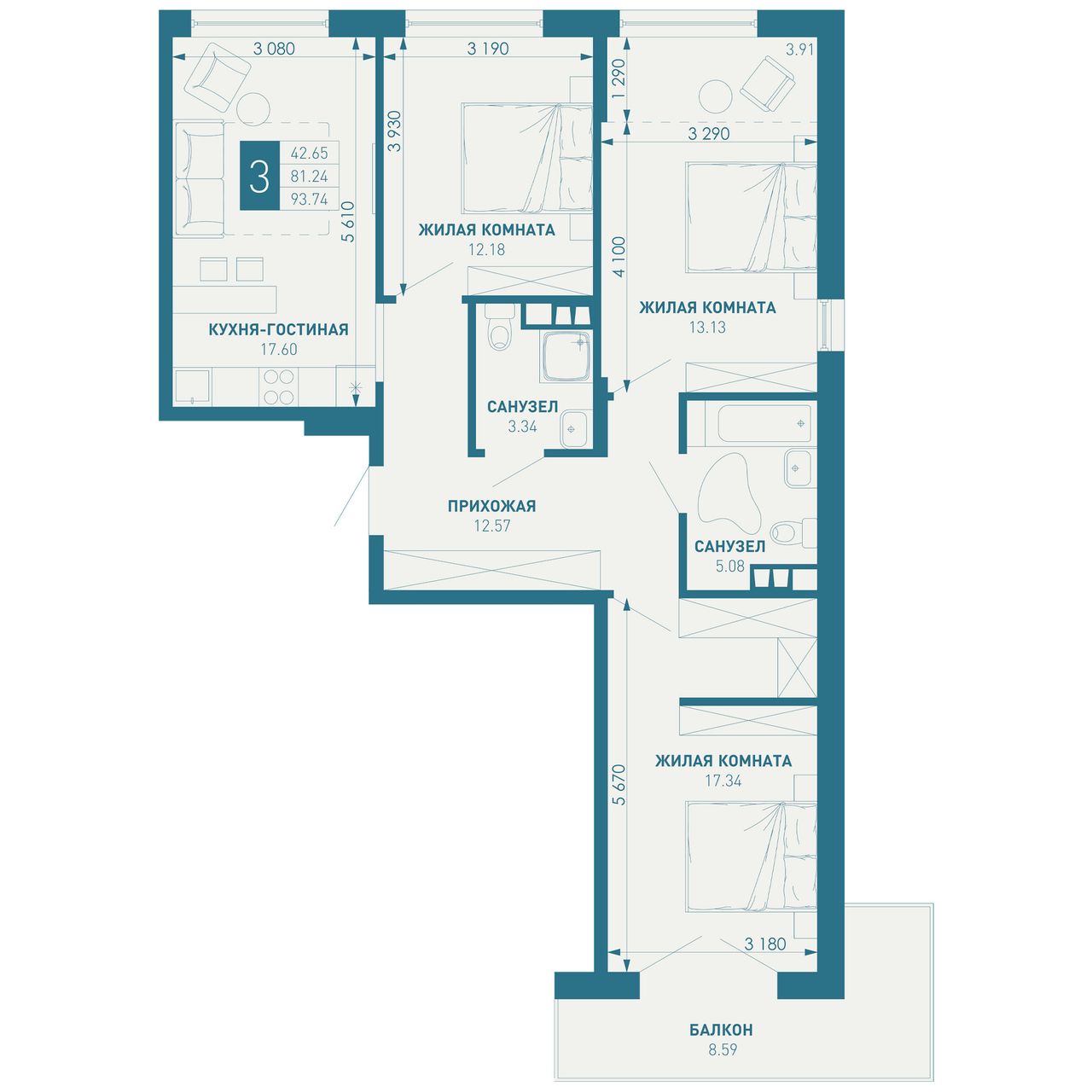 3-комнатная — 93,74 м² 7/18 эт. в ИНАЧЕ в Молодёжном