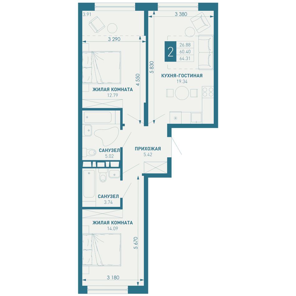2-комнатная — 66,1 м² 5/18 эт. в ИНАЧЕ в Молодёжном