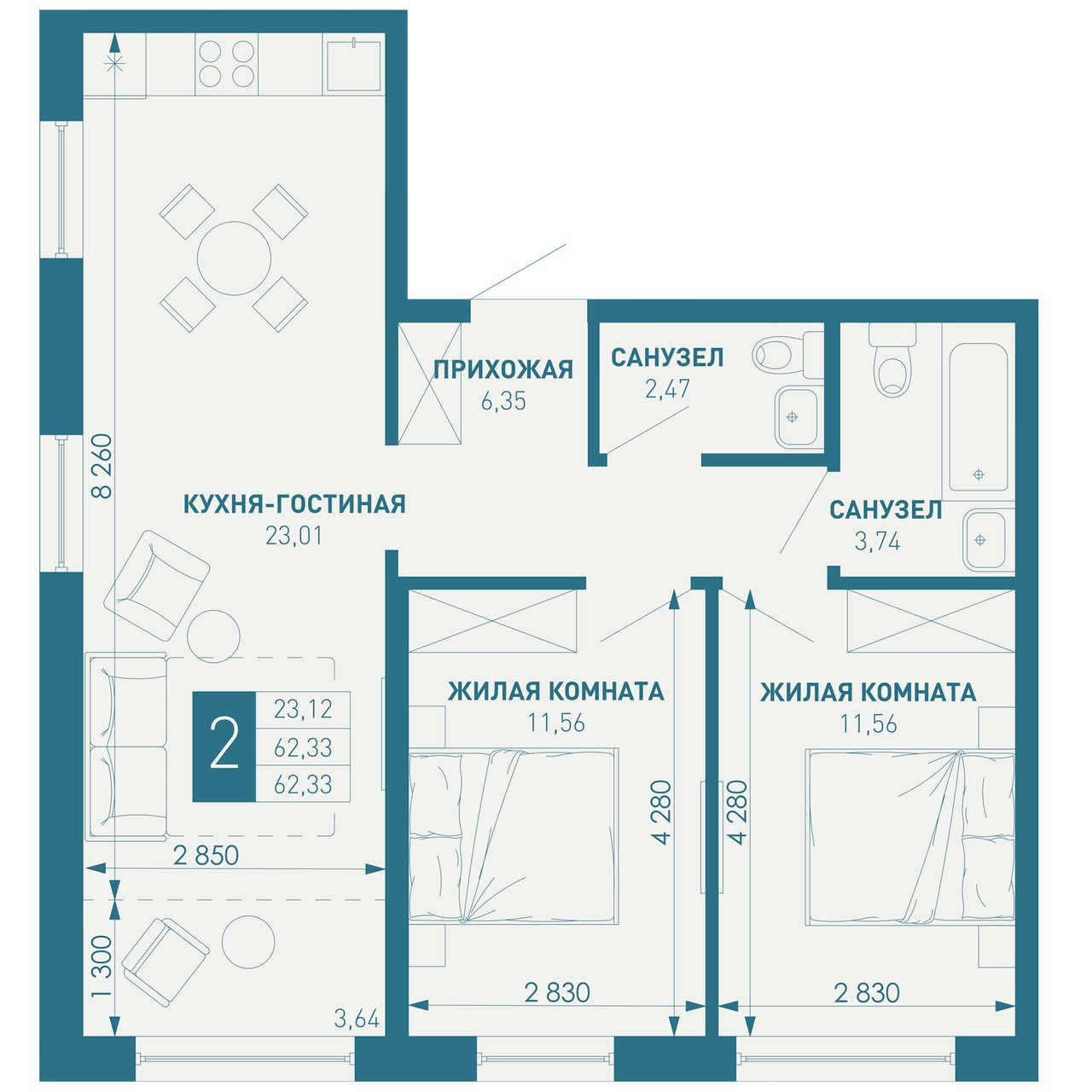 2-комнатная — 62,33 м² 12/18 эт. в ИНАЧЕ в Молодёжном