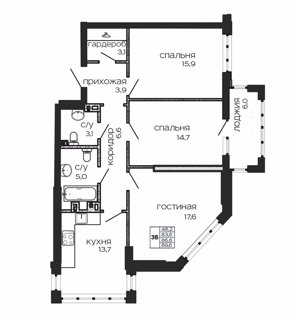 3-комнатная — 89,2 м² 2/17 эт. в Театрал