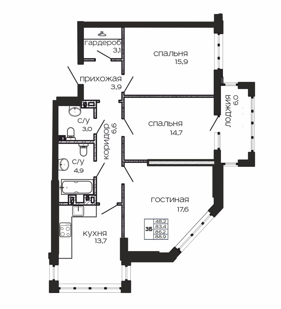 3-комнатная — 88,4 м² 3/17 эт. в Театрал