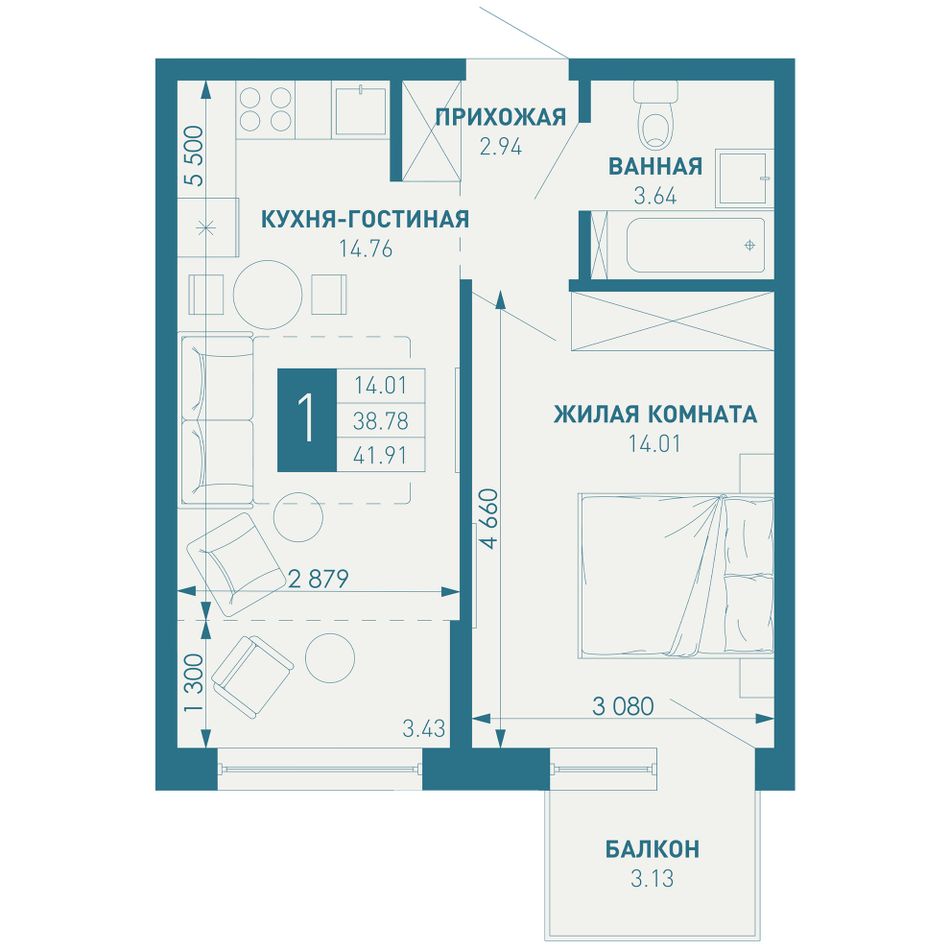 1-комнатная — 41,91 м² 5/18 эт. в ИНАЧЕ в Молодёжном