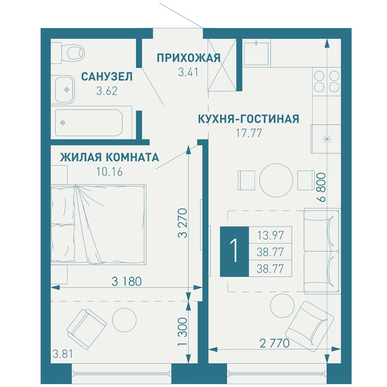 1-комнатная — 38,77 м² 4/18 эт. в ИНАЧЕ в Молодёжном