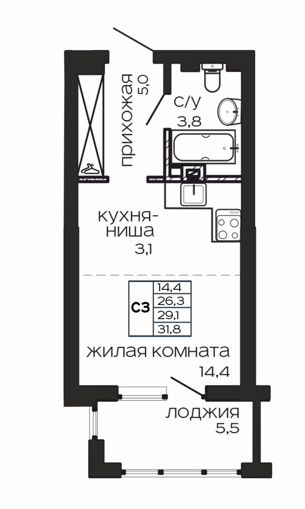 Студия — 31,8 м² 2/17 эт. в Театрал