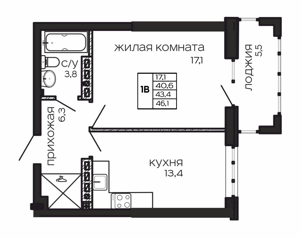 1-комнатная — 46,1 м² 10/17 эт. в Театрал